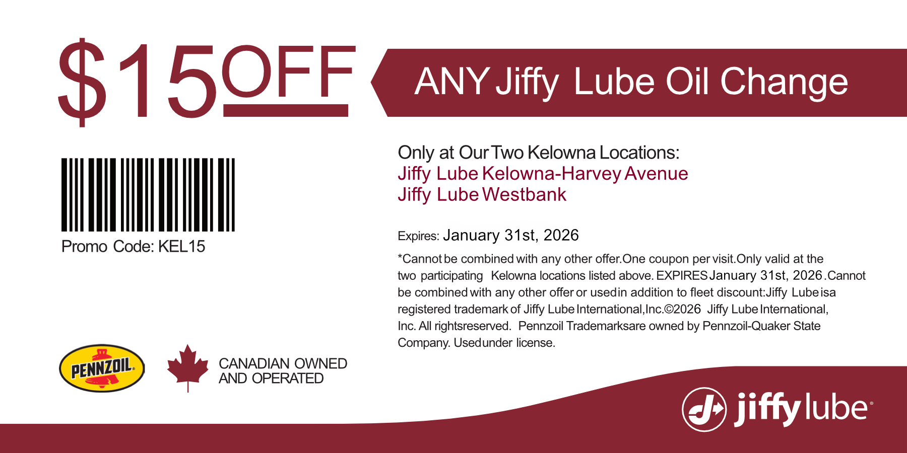 *Cannot be combined with any other offer. One coupon per visit. Valid at participating locations in Canada. EXPIRES January 31st, 2026. Cannot be combined with any other offer, or used in addition to fleet discount: Jiffy Lube is a registered trademark of Jiffy Lube International, Inc. C 2026 Jiffy Lube International lnc. All rights reserved Pennzoil Trademarks are owned by Pennzoil-Quaker State Company. Used under license.